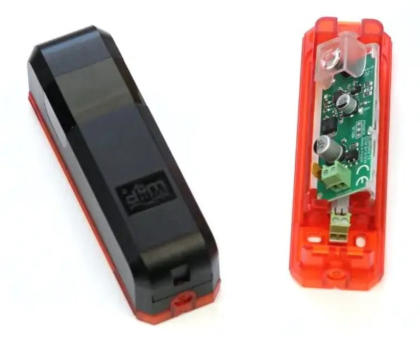 Bariera fotooptyczna do bram, zasilanie 12-24V AC lub DC, regulowany kąt 180st. (możliwość zamontowania od czoła bramy bez konieczności stosowania dodatkowych dystansów), zasięg działania do 15m. Wersja z podświetleniem LED.