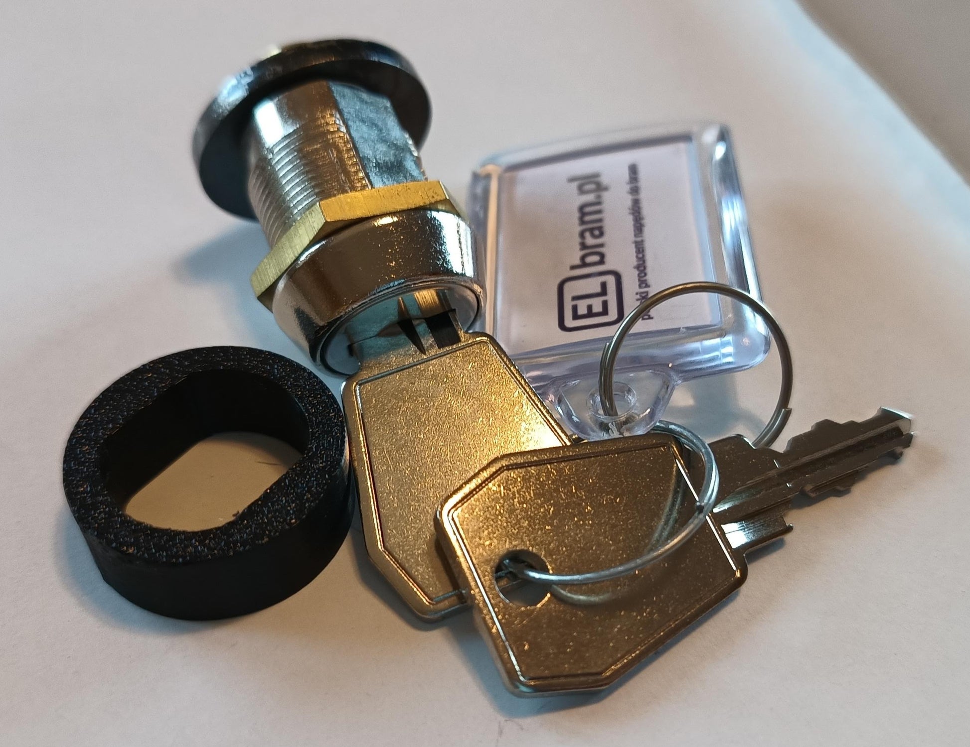 Kompletny zamek do mechanizmu przesuwnego ELBRAM VIS40. Zestaw zawiera zamek z indywidualnym numerem, 2 klucze, tulejkę dystansową, breloczek, nakrętki i podkładkę oraz mimośród do rozsprzęglania napędu.